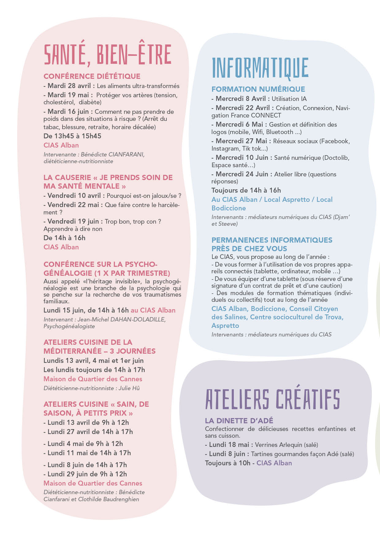 Le trimestre fait également la part belle à la santé et au bien-être, avec des conférences et ateliers autour de l’alimentation, de la santé mentale et des habitudes favorables au quotidien. Les ateliers cuisine, numériques et pratiques vous offrent l’occasion d’apprendre des gestes utiles, simples et accessibles, à reproduire facilement chez vous.