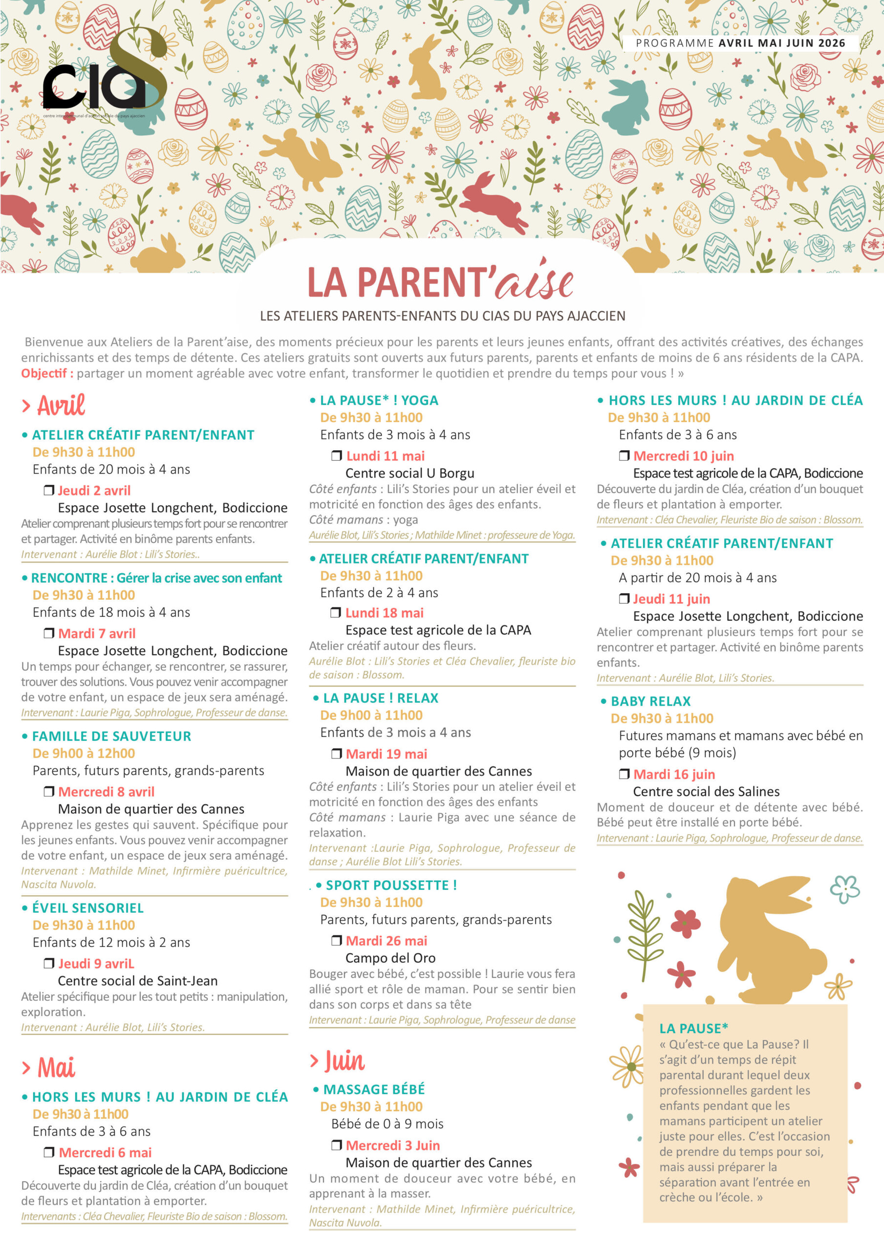 Le CIAS organise différentes actions de soutien aux familles et à la parentalité. Il s’agit de la Parent’aise qui s’organise autour de deux dispositifs :